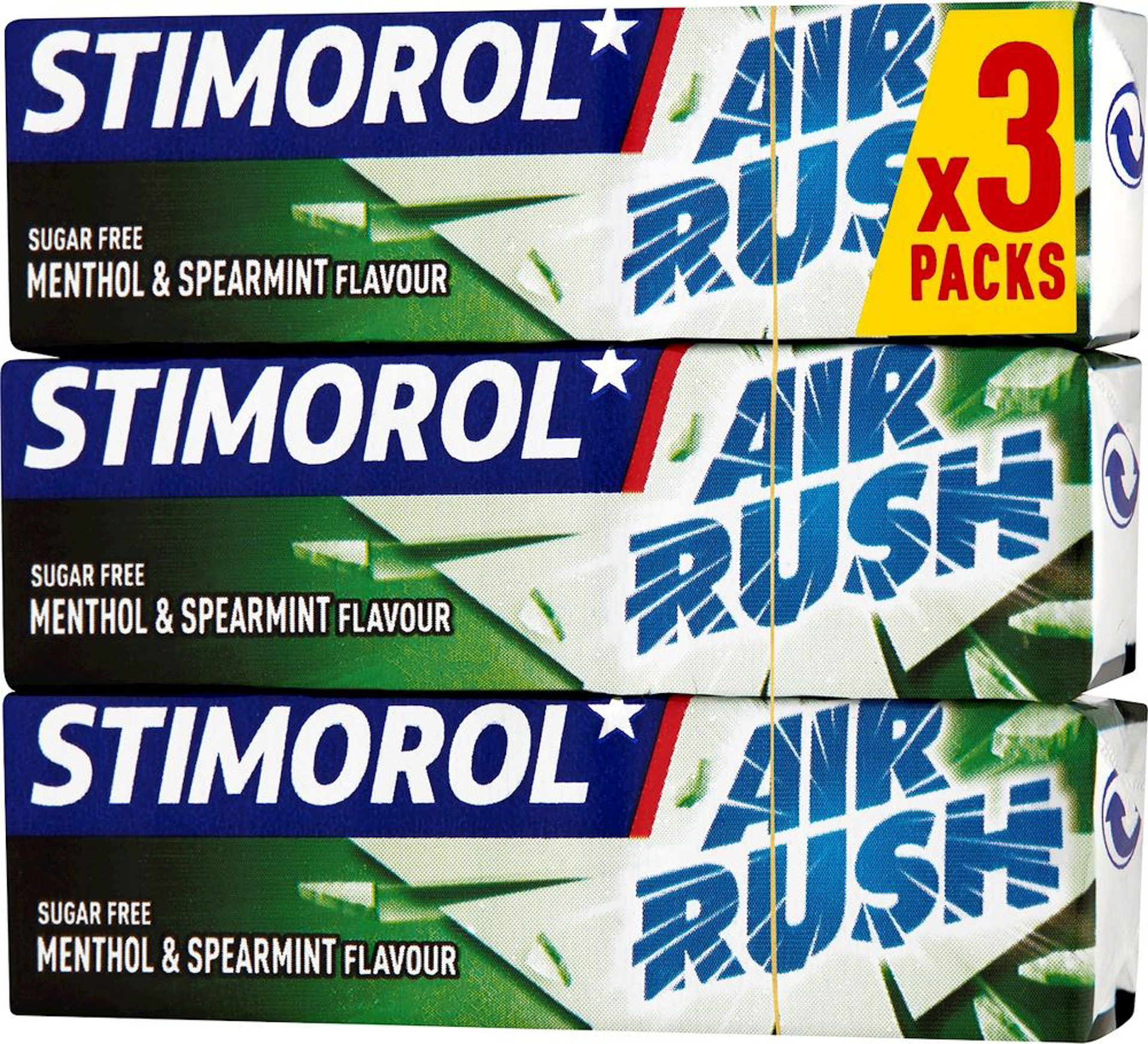 Stimorol Air Rush Menthol & Spearmint er tyggegummi med en ekstra frisk og stærk smag. Desuden er tyggegummiet sukkerfrit. Her i en sampak med 3 pakker.